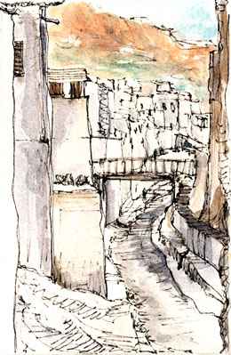 道だか分からない程狭い道。迷路のように入り組み、人とすれ違うのもやっとという感じ。