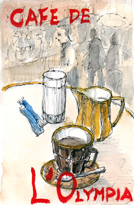 オペラとマドレーヌの間にあるカフェに入り、カフェと外の景色を描く事にした。
