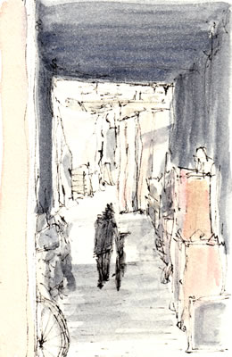外に出、クサビンモスクの裏通り、モロッコの庶民の生活の臭いがする通りで