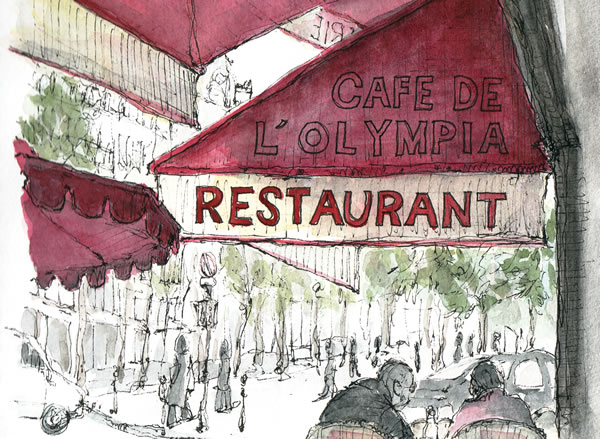 オペラとマドレーヌの間にあるカフェに入り、カフェと外の景色を描く事にした。